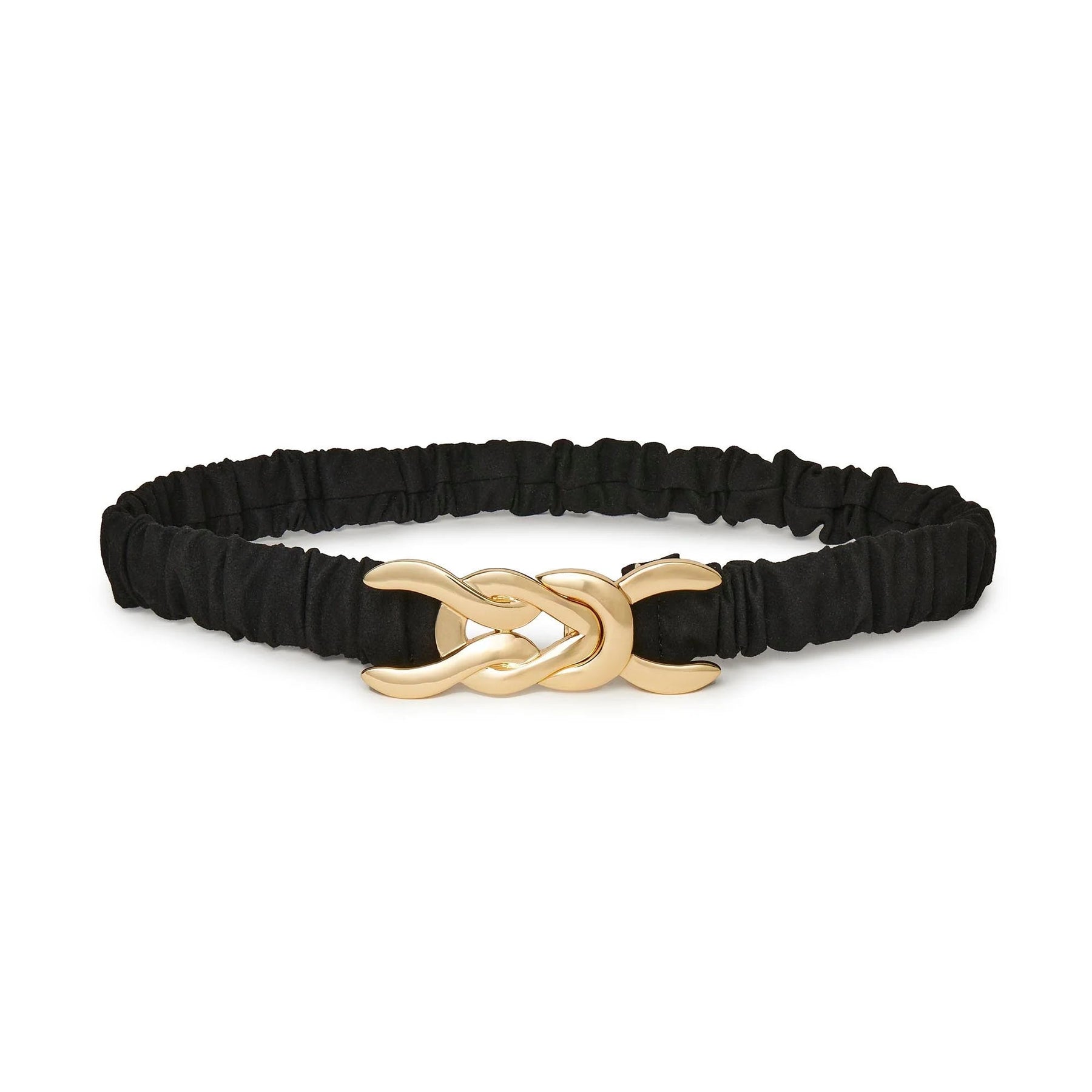 Our Biltmore Buckle Belt features stretchy a ruched fabric connected with 14k gold-plated interlocking clasp closure.