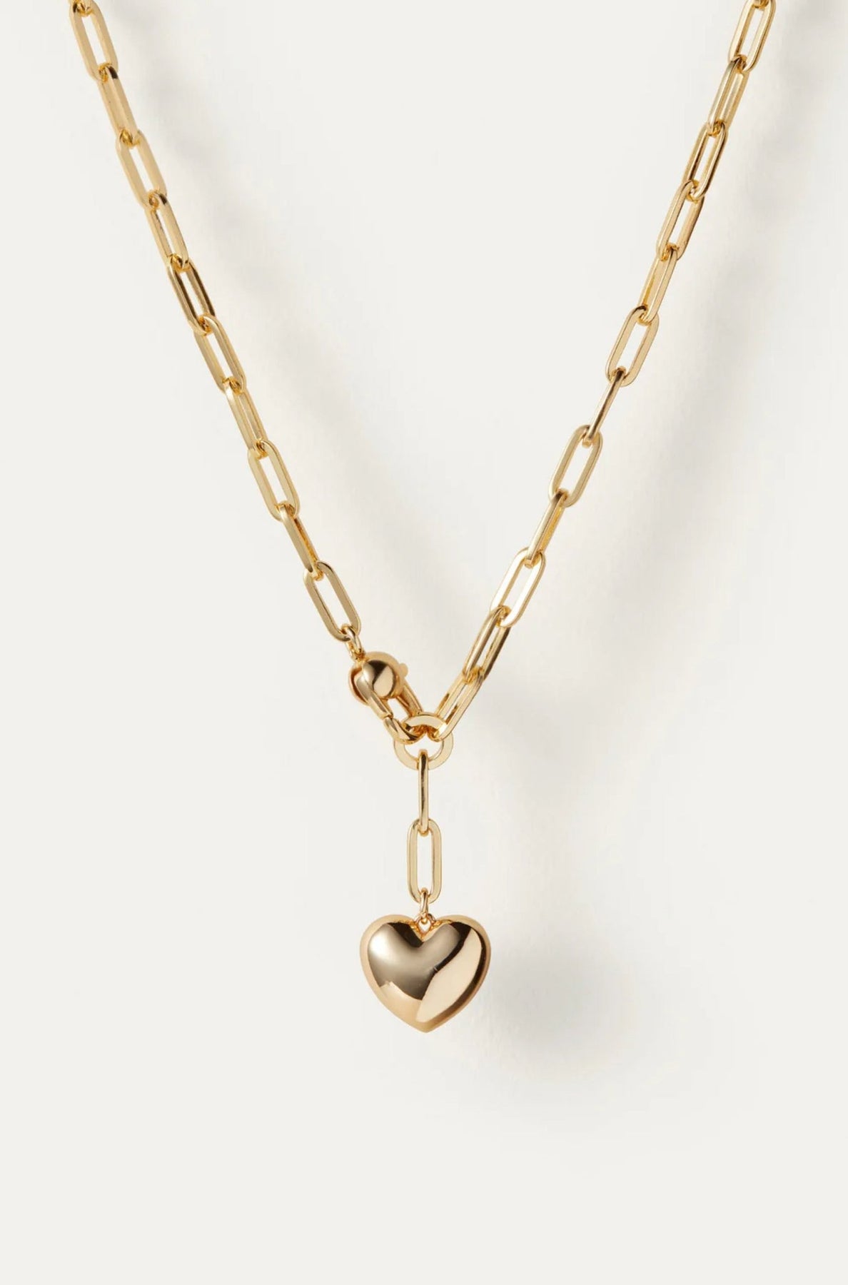 A joyful, inflated heart is suspended from a paperclip link chain necklace. Finished in high-polish gold.