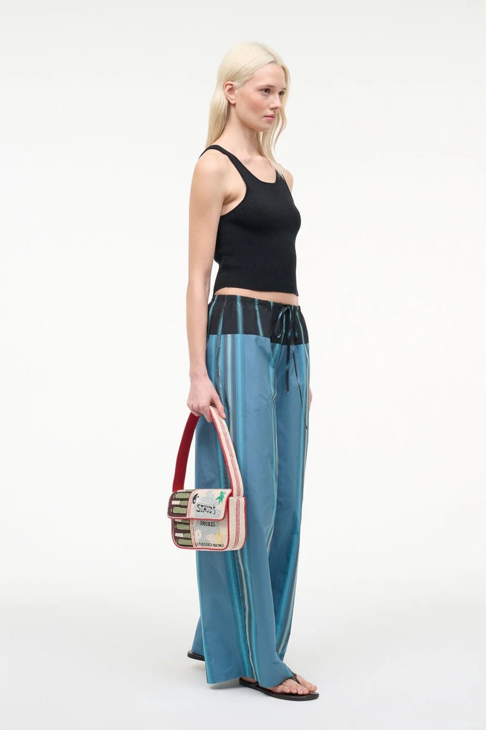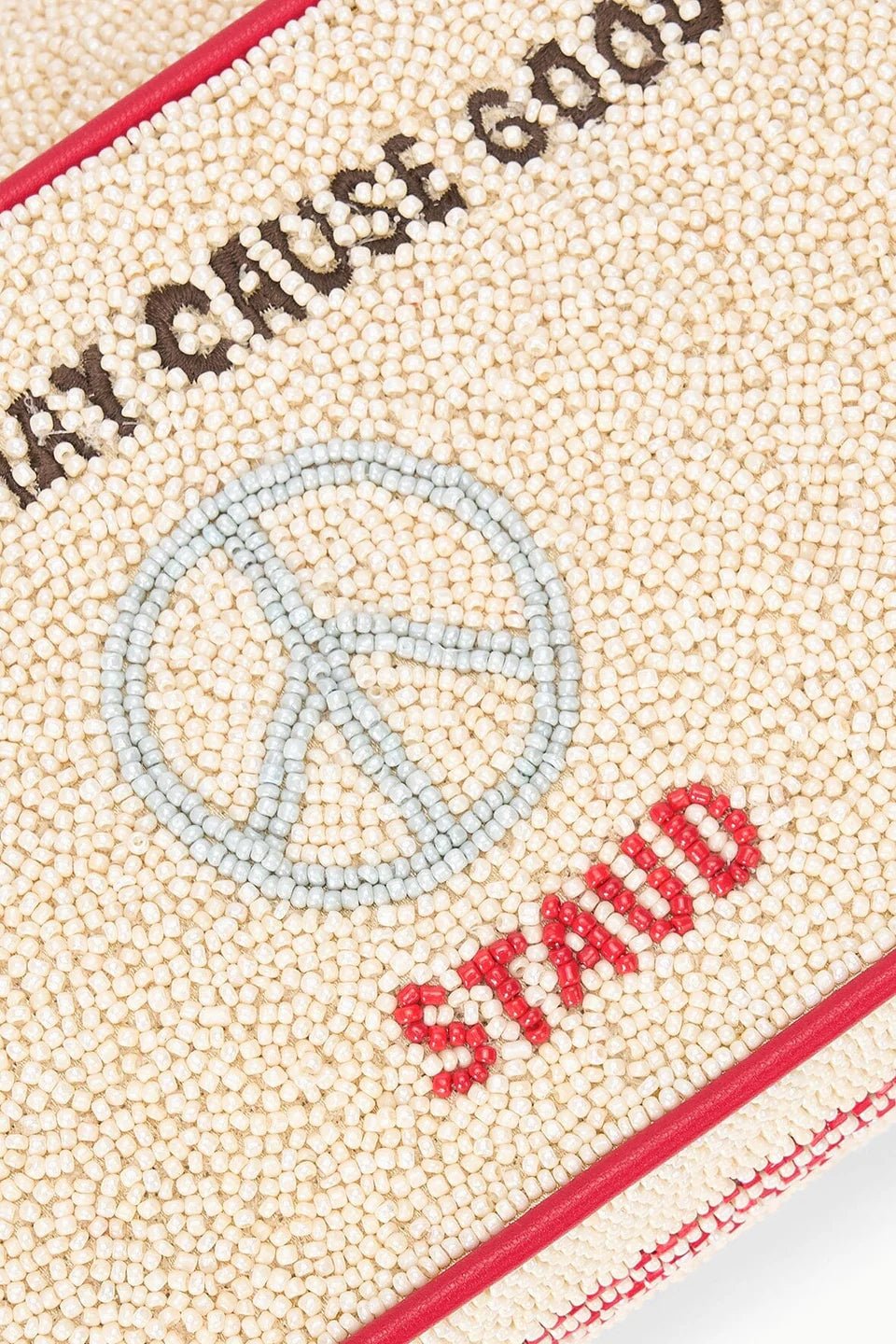 Our latest limited-edition Tommy features a playful seasonal print. The Tommy Bag is a hand-beaded shoulder bag with vegan leather piping. This style features a single flap closure, inner zip, and a back slip pocket.