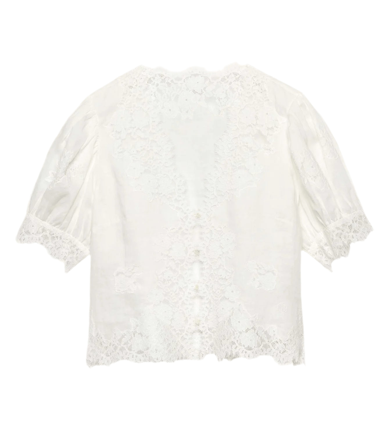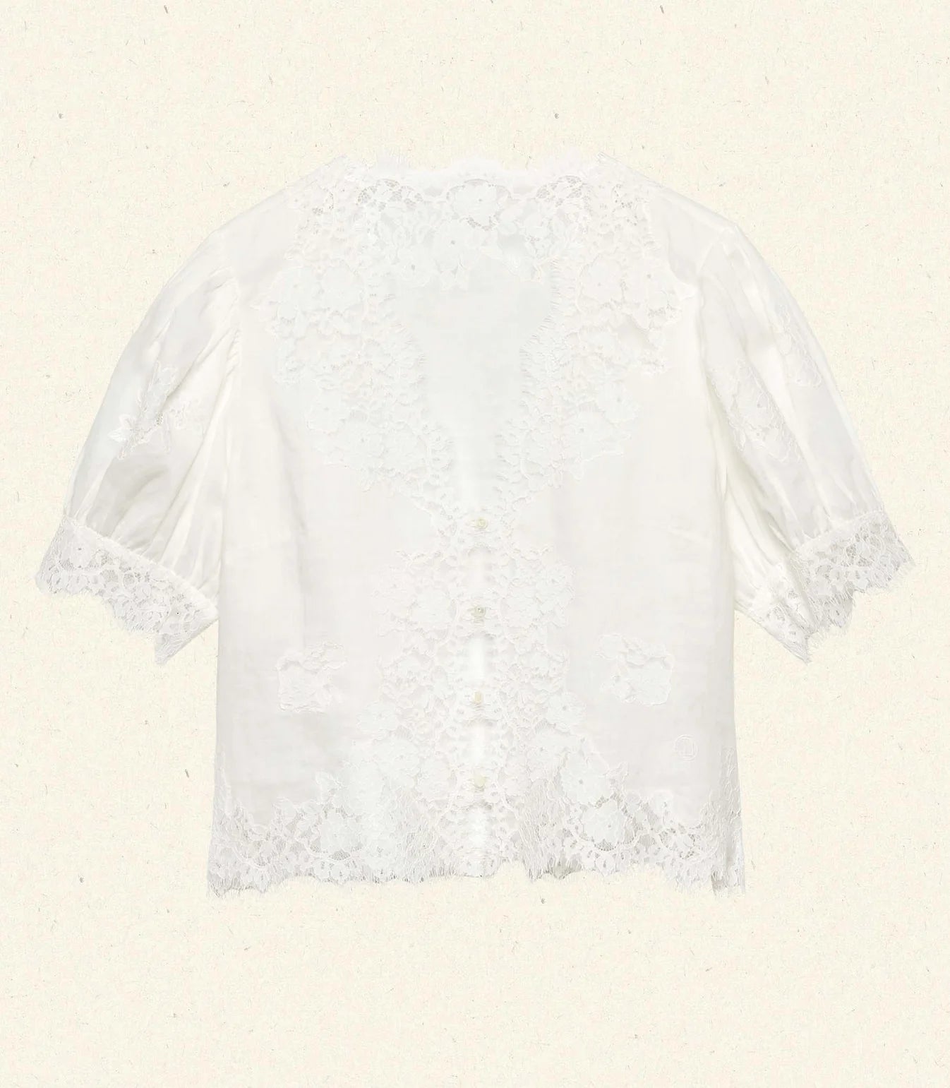 Crafted from crisp, lightweight ramie, the antique-inspired DÔEN Heirloom Idella Top features a plunging V-neckline, short puffed sleeves, and a breezy cut. Intricate embroidered floral lace trims the neckline, sleeve cuffs, center front placket, and slightly cropped hemline, while lace insets adorn the sleeves and bodice. An embroidered “D” emblem finishes the front left hem, and a line of mother-of-pearl buttons extends down the front.