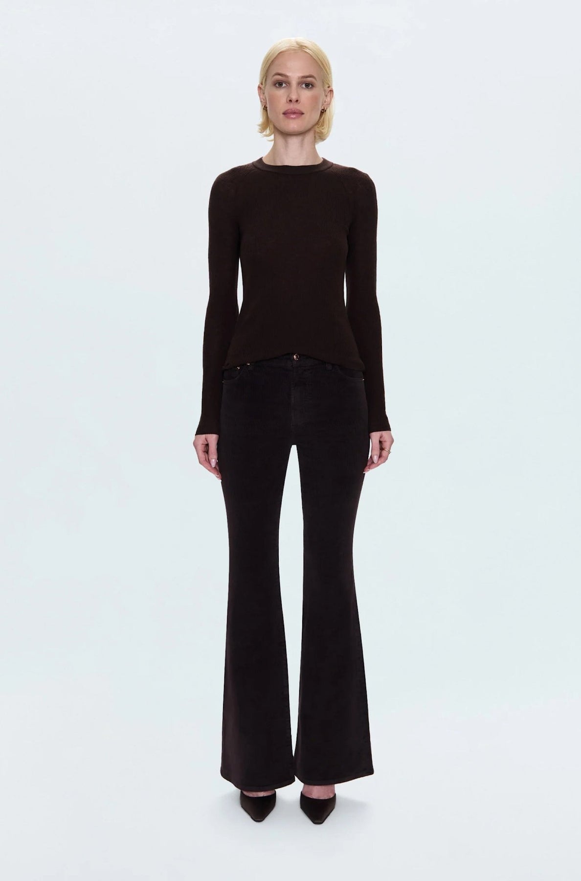 The flare that brings the drama. Kinsley sits at a comfortable mid rise with an ultra flare silhouette and full-length 32 1/2" inseam that creates maximum movement and vintage-inspired proportions. The dramatic flare from knee to hem delivers retro sophistication with modern comfort. Crafted from stretch denim in Mocha, a warm brown tone—the color of the moment that's defining this year's palette.