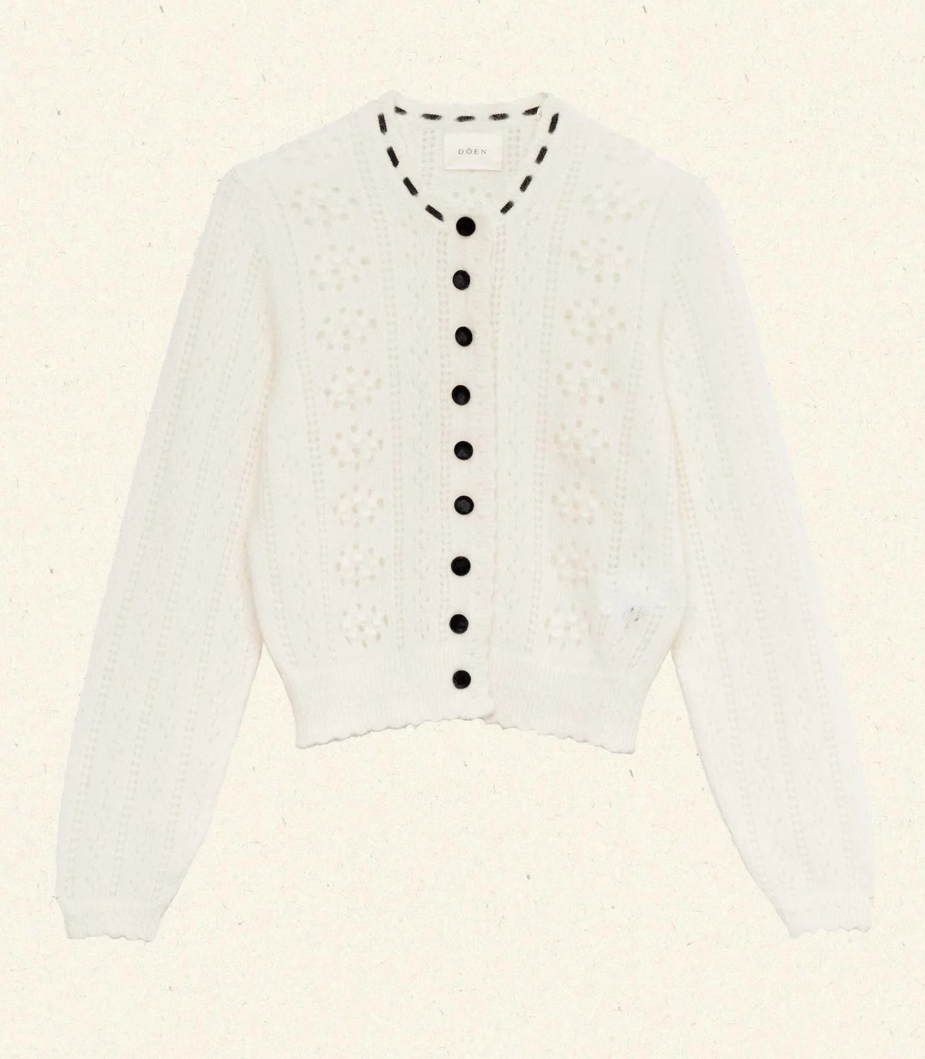 The ‘50s-inspired Cosette Cardigan is crafted from a soft baby alpaca-wool blend, detailed with an allover pointelle stitch. Designed with a fitted silhouette and full-length sleeves, it’s finished with velvet buttons and a grosgrain ribbon woven through the crew neck.
