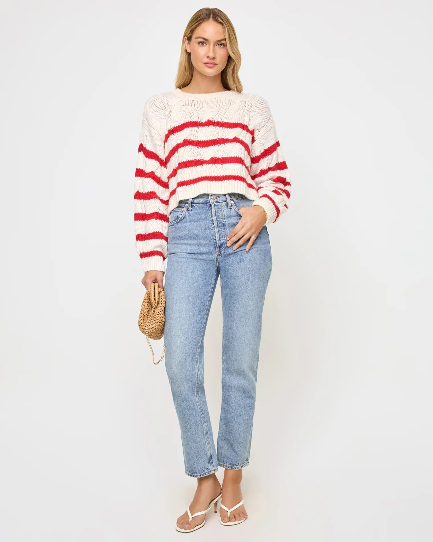 Come on over and cozy up in the Kensley Pullover. This cable knit crew has nautical stripes and a cropped silhouette. Pull on your go-to denim for a refined style with a pop of preppy.