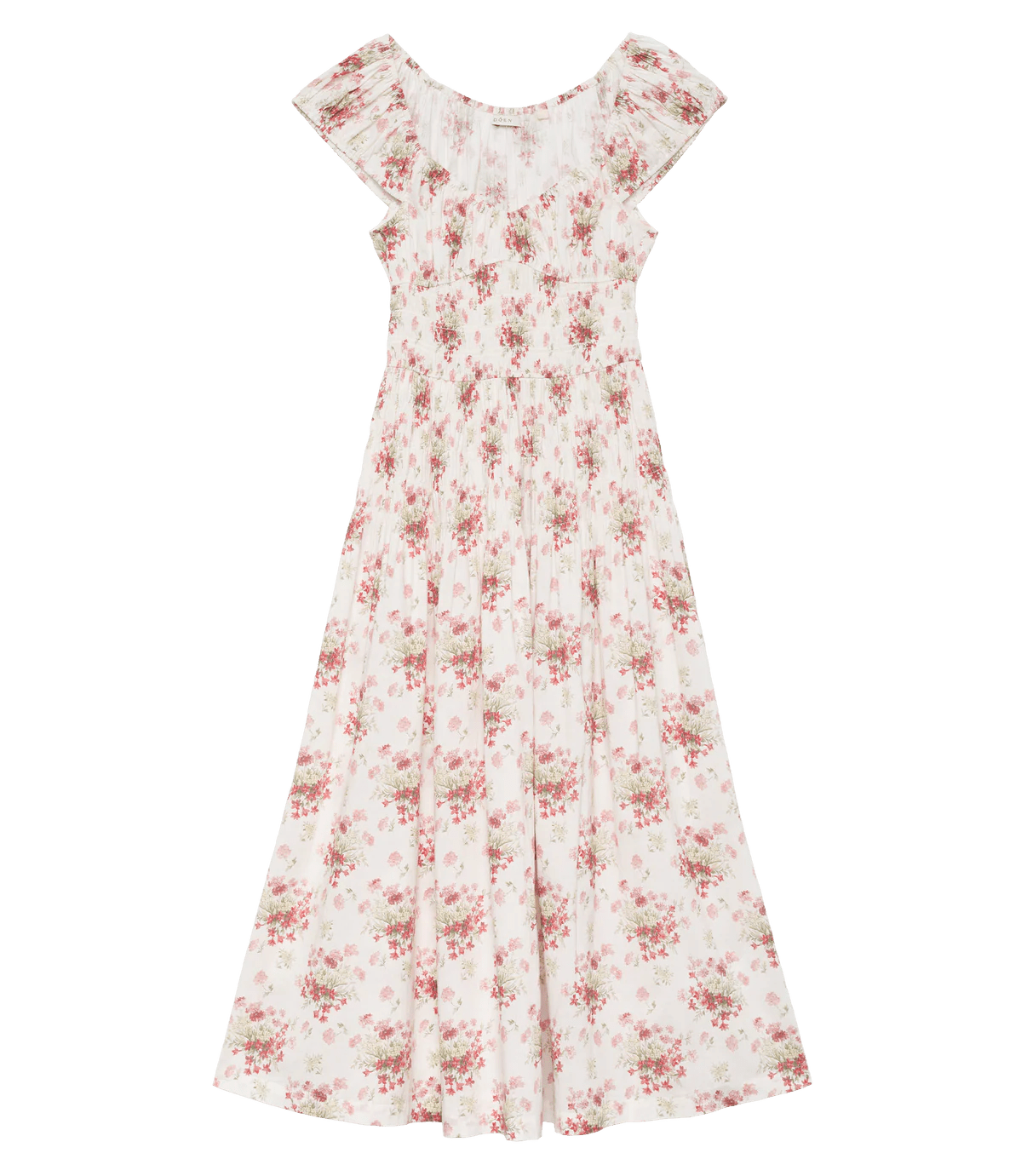 The Quinette Dress is a new take on our beloved Quinn Dress, reimagined with a soft sweetheart neckline and delicate cap sleeves. Cut from soft organic cotton voile in our Lantana Floral, it features a flattering shirred bodice with fixed smocking at the waist that extends into a midi-length skirt.