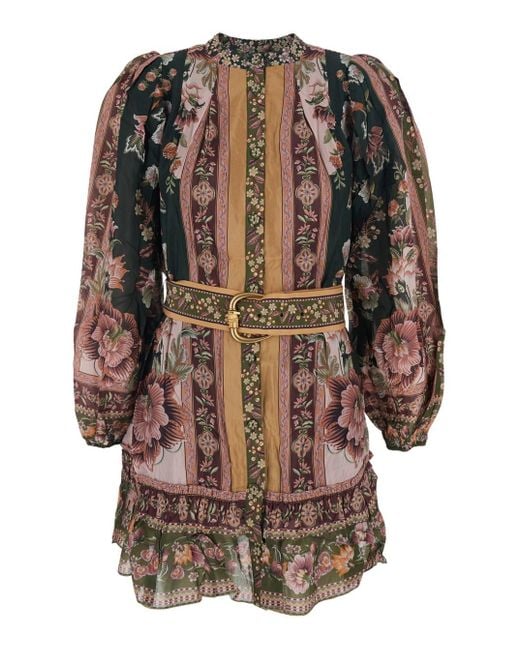 The Green Flowering Garden Tree Mini Dress invites you into a whimsical botanical world with its rich green and soft pink floral print. A structured high neckline complements voluminous puff sleeves, while the cinched waist with a matching belt frames a playful silhouette. Delicate ruffles skirt the hem, adding movement and charm to this enchanting mini dress, perfect for sparkling in sunlit gardens or lively city adventures.