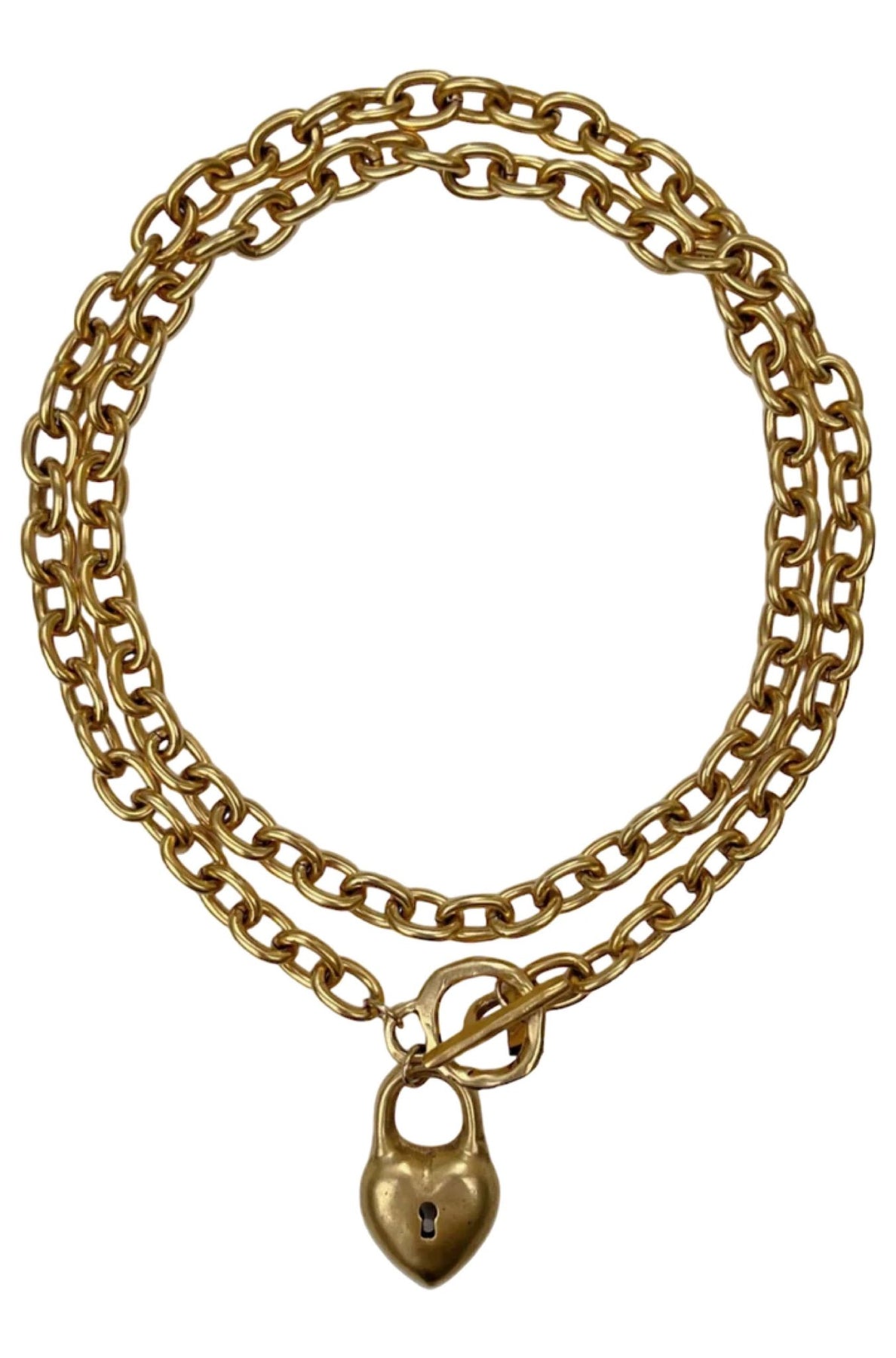 It features a beautiful 12k antiqued gold plated pewter puffed heart lock charm and an oversized 12k antiqued gold plated pewter toggle clasp