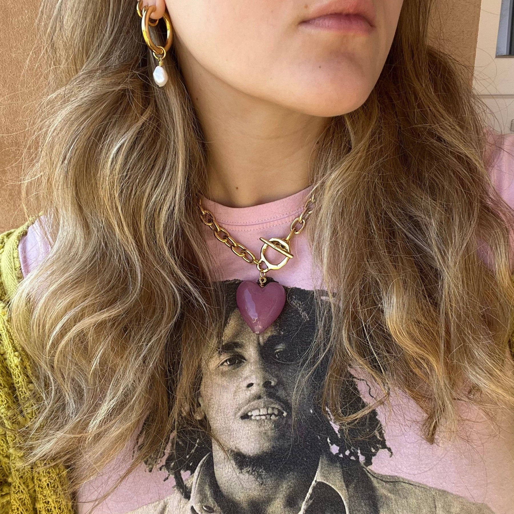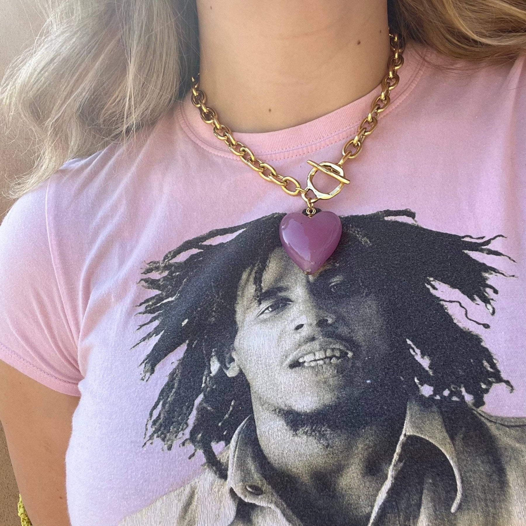 17.5” chunky 12k antiqued gold plated stainless steel chain, large 12k antiqued gold plated pewter toggle clasp, and a statement Murano blown glass heart pendant imported from Italy <3. Comes in a variety of delicious colors!