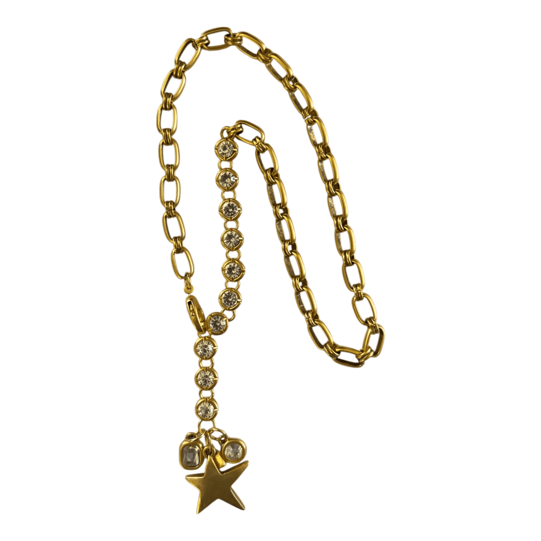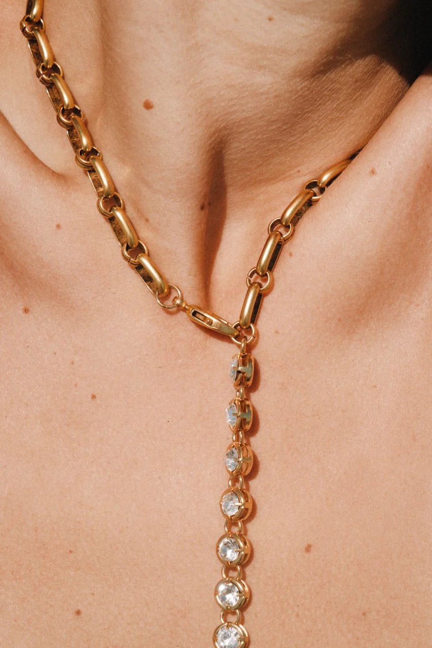 Leon seamlessly marries 12k antiqued gold plated brass crystals, 12k antiqued gold plated brass oval multi-ring chain and 12k antiqued gold plated pewter charms. At 19" total, Leon is flexible in how she can be worn. The swivel lobster clasp can be fastened anywhere on the chain. Play around! Have fun!!!
