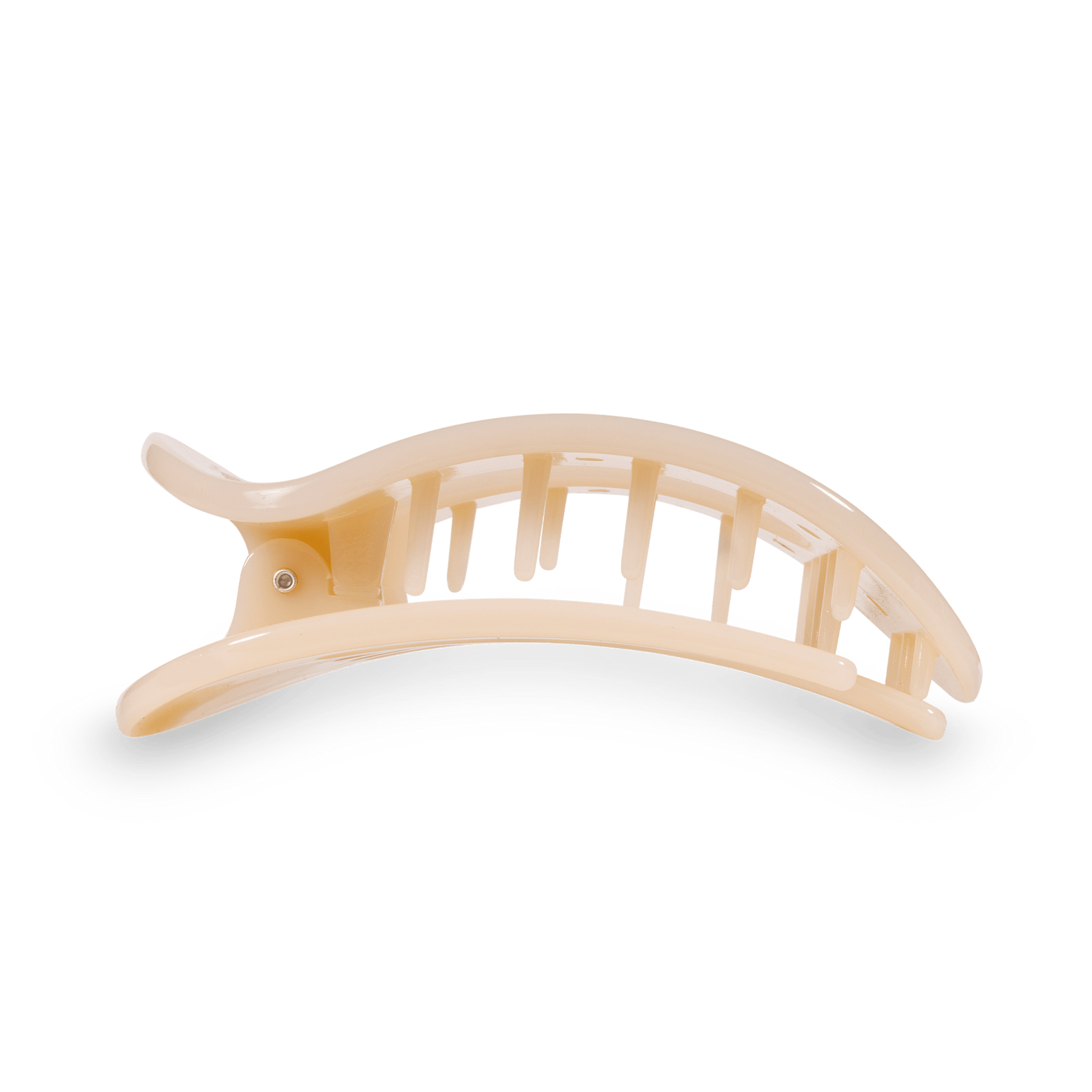 Lay flat and relax with the new TELETIES Almond Beige Medium Flat Round Hair Clip in Beige. This hair clip is designed to allow you to lay back flat, do yoga, or sit comfortably in a seat with a headrest, and it is made with the same material that is nearly unbreakable. Lay down flat with comfort Bendable teeth for a secure yet gentle hold Lightweight, durable, and hair-friendly Perfect for all-day wear—from sunup to sundown Medium clips are great for thick to medium thickness of hair.