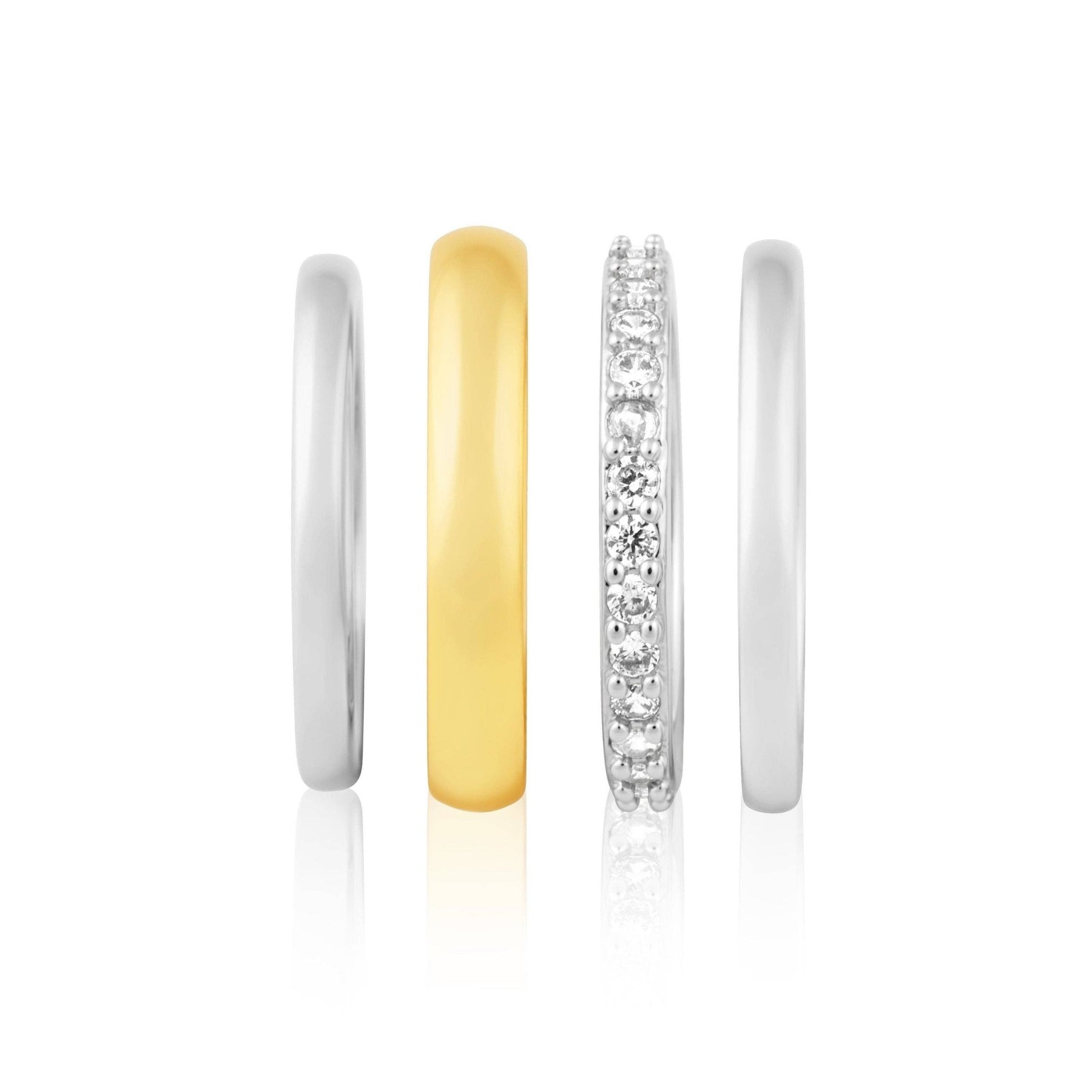 Unleash your daring style with the Faye Ring - Two Tone. This bold and striking ring stack features two tones, creating a sleek and unique look that will make you stand out from the crowd. Take a risk and rock this statement piece for a touch of adventure in your wardrobe. * 18K Gold Plated over Stainless Steel * Pave cz stones * Hypoallergenic