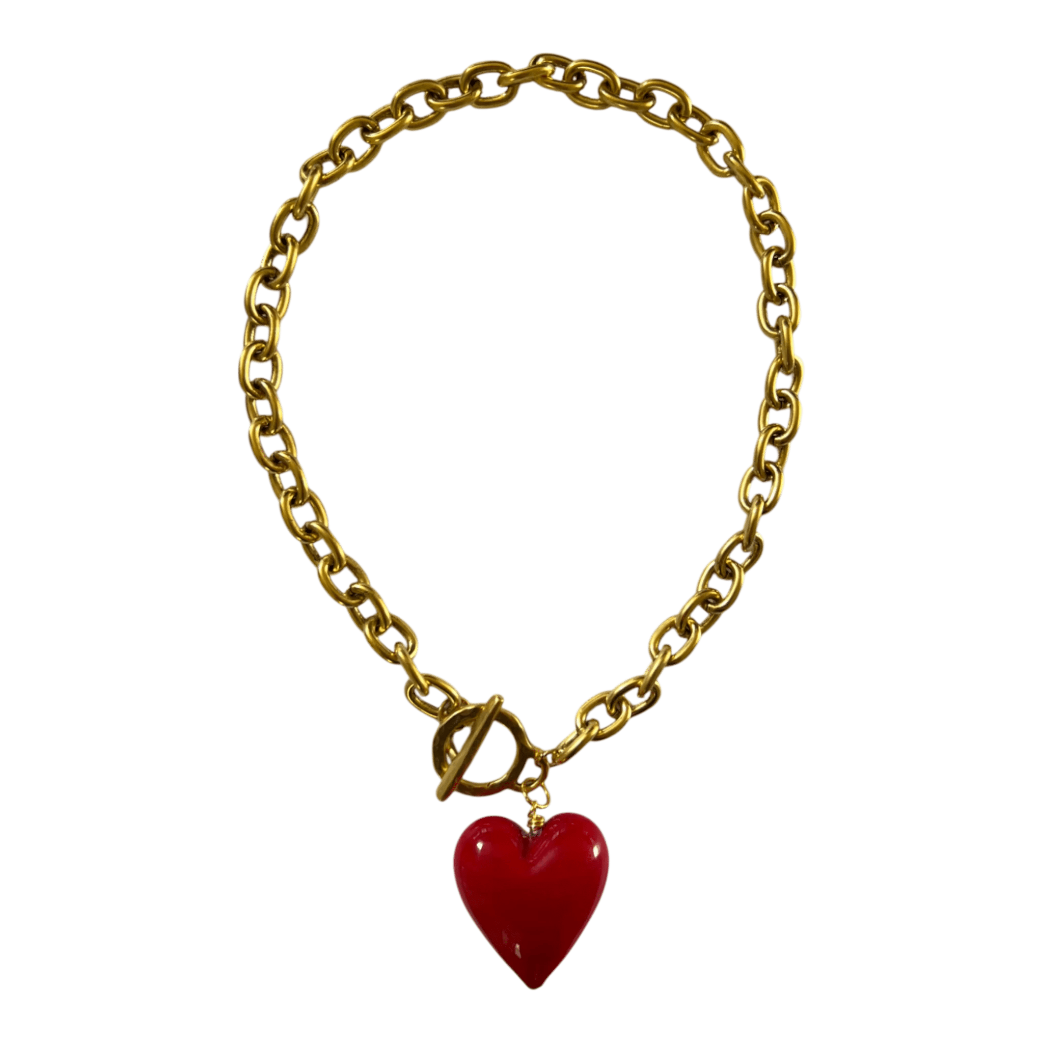 17.5” chunky 12k antiqued gold plated stainless steel chain, large 12k antiqued gold plated pewter toggle clasp, and a statement Murano blown glass heart pendant imported from Italy <3.