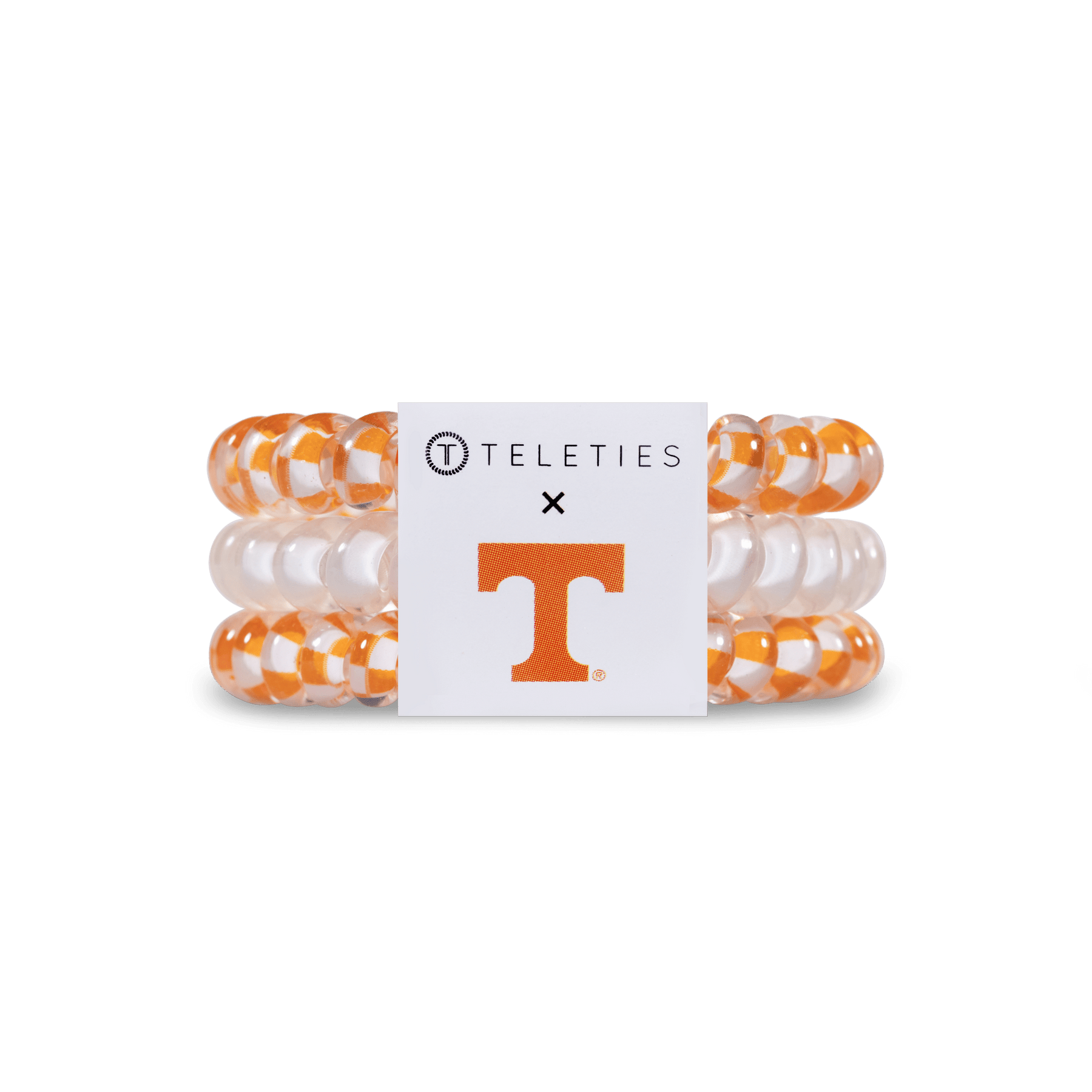Hold your hair and enhance your collegiate style with University of Tennessee TELETIES. The strong grip, no rip hair tie that doubles as a bracelet. Strong, pretty and stylish, TELETIES are designed to withstand everyday demands while taking your look to the next level. Sold in packs of three. The small size is 4.5cm wide x 0.5cm thick.