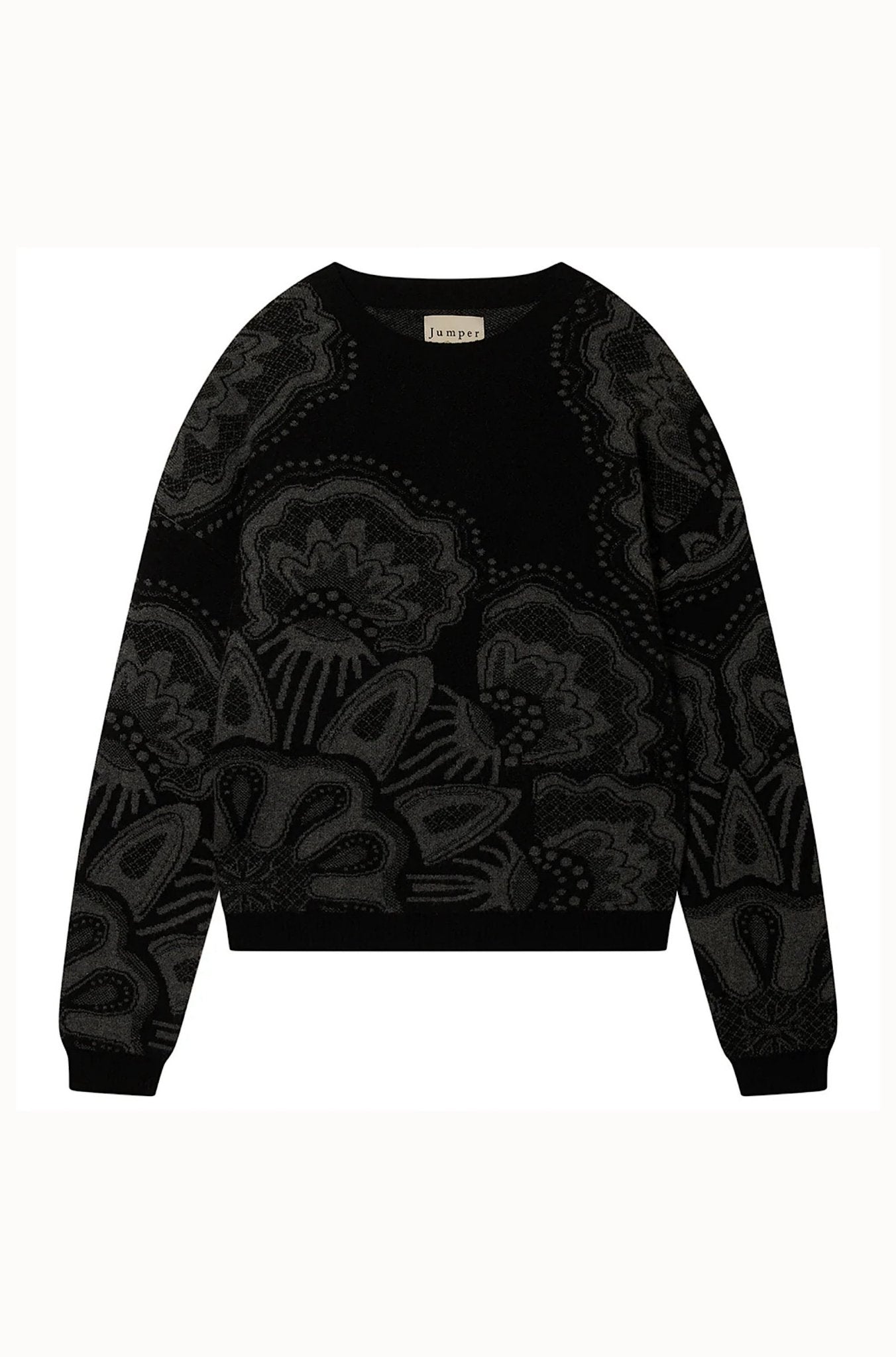 Jumper 1234 cashmere and wool jumper. Our heavier weight cashmere and wool blend oversize crew neck with an amazing (even if we say so ourselves) all over 'doily' jacquard pattern in black and mid grey. We know we'll be wearing this one on repeat! And there are 3 colours to choose from!