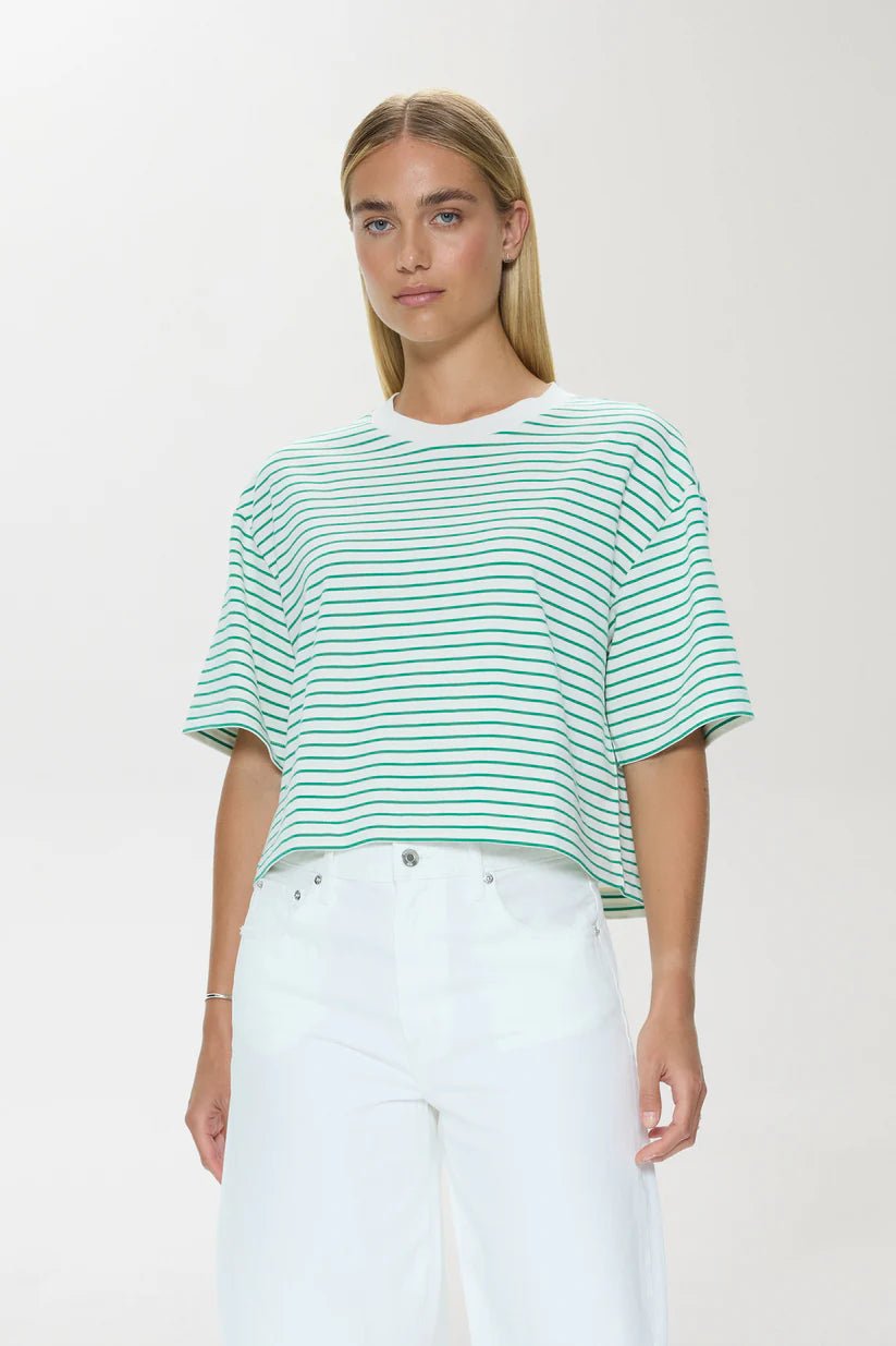 Mae updates the essential tee with an oversized fit, half sleeves, and a clean, cropped length. The open-back cutout softens the silhouette for a subtle, feminine reveal, while the crisp green and white stripe brings fresh appeal to this borrowed-from-the-boys shape.