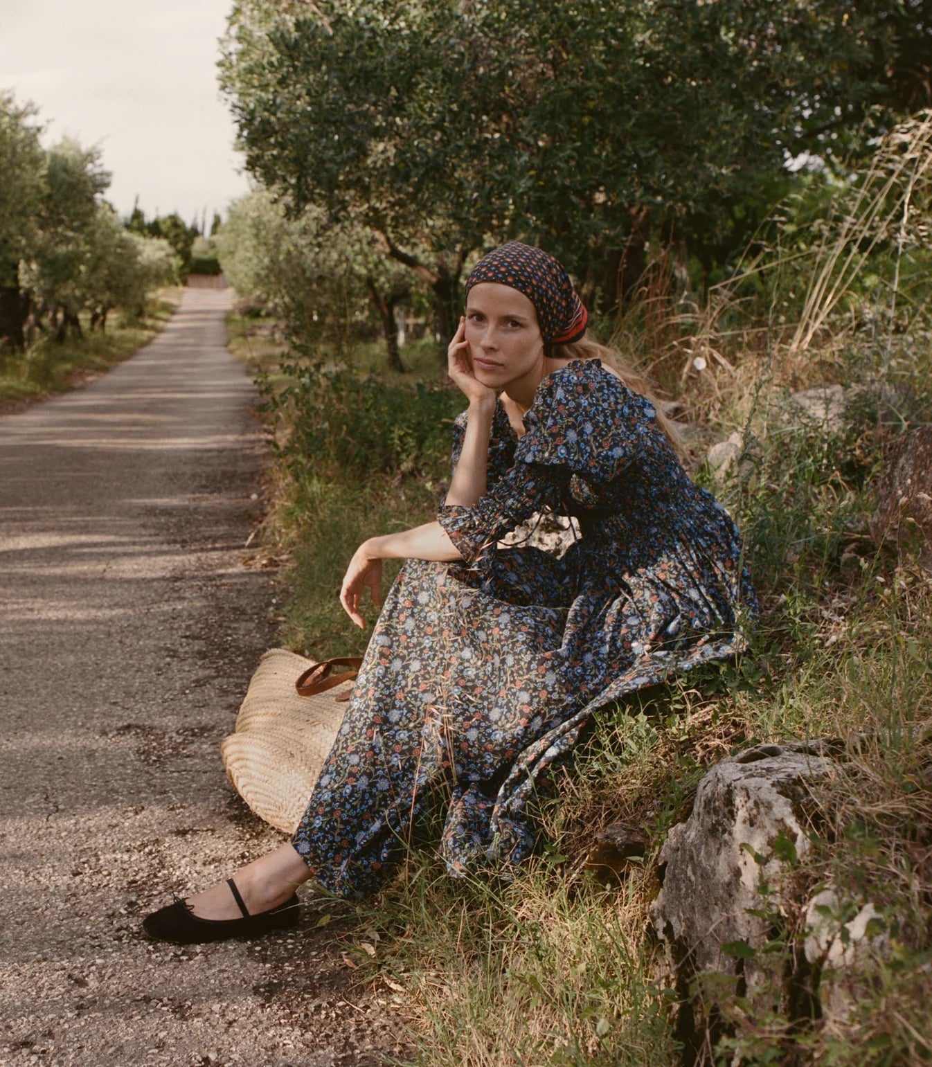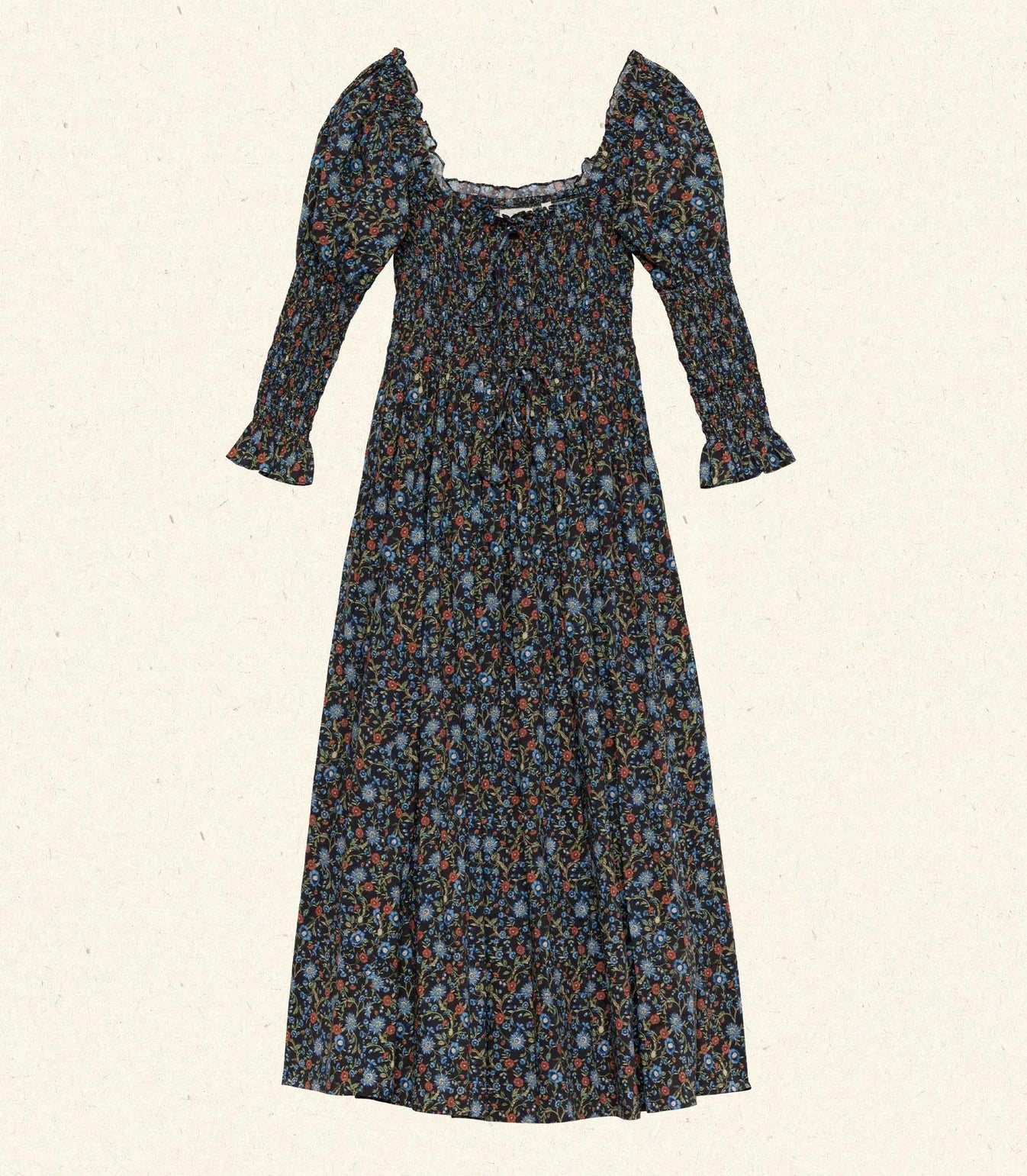 A favorite since its Spring 2019 debut, the Bijou Dress returns in our Prairie de Montagne floral. Crafted from midweight organic cotton voile, the Bijou features a square neckline and Juliet sleeves that puff out at the shoulders and fit closely along the arms with elasticized smocking. The bodice is fully smocked with a fixed tie at the neckline and an adjustable tie at the waist, extending into an ankle-grazing A-line skirt.