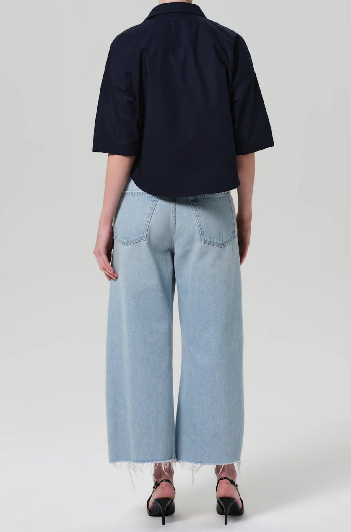 The Ayla Raw Hem Crop, inspired by a reworked vintage silhouette, features a slightly relaxed but flattering top block that transitions into a roomy leg with a raw hem finish. Perfect for warmer days, this cropped denim is crafted from 100% regenerative cotton, offering both comfort and sustainability in a timeless, versatile style. Style it effortlessly with a tucked-in blouse and sandals for a relaxed daytime look, or elevate it with a sleek heel and tailored blazer for an elevated take on casual chic.