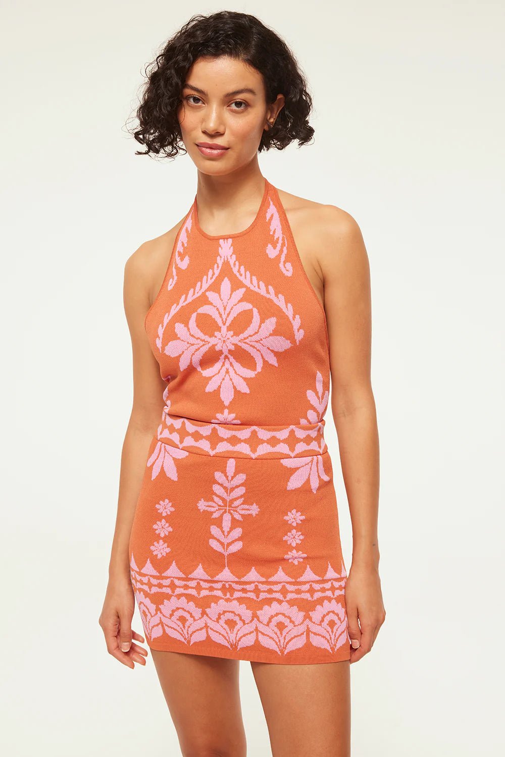 Hali is a knit jacquard halter top that ties at the lower back and features a pink floral motif on papaya ground. Pair with the matching Leni skirt or a pair of your favorite jean shorts.
