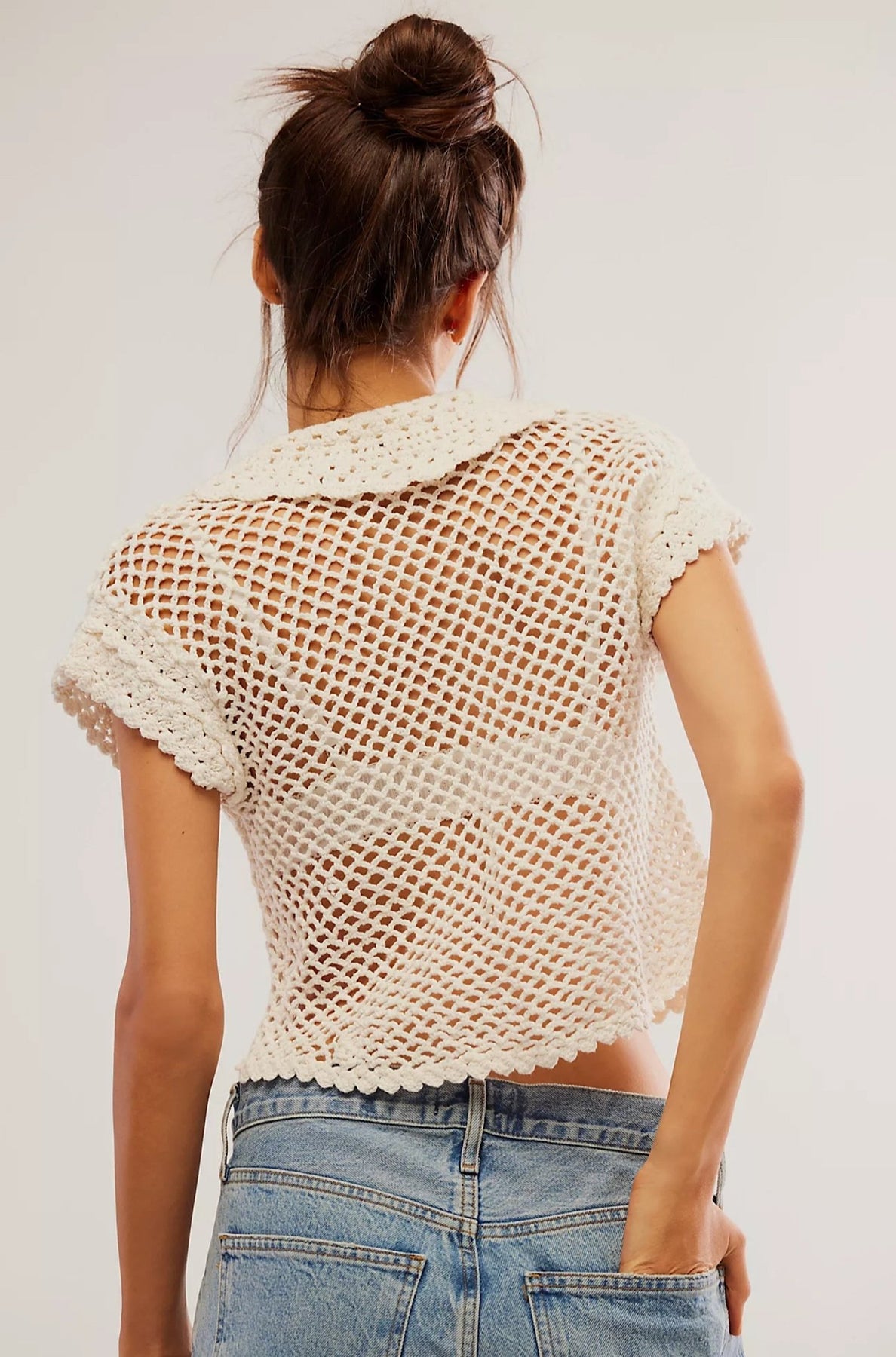 So cool in crochet, this effortlessly easy top is featured in an open-knit fabrication and slightly cropped fit with a collared neckline and scalloped trim.