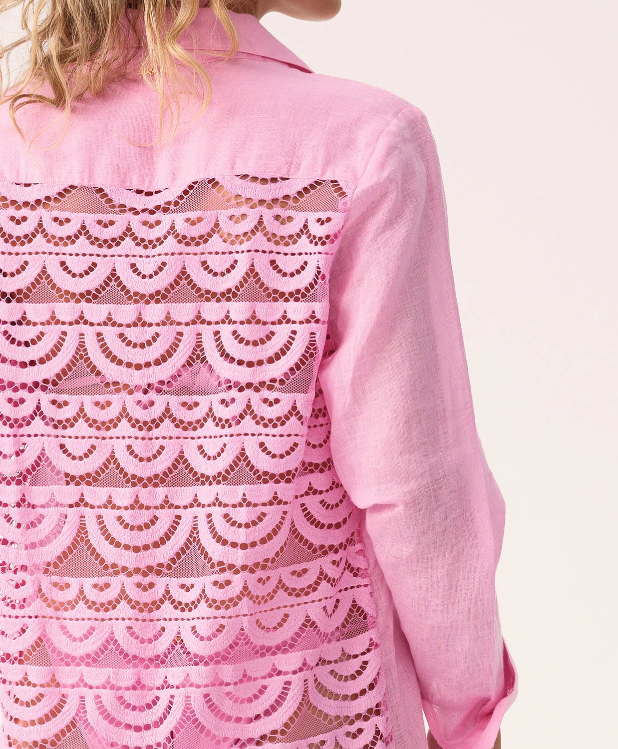 The Wisteria Lace Millie Tie Tunic is crafted from soft pink linen and finished with a statement back—featuring our iconic hand-cut, scalloped lace from shoulder to hem. Designed to tie at the waist, it layers beautifully over swim while adding a delicate, elevated touch to any beach look.