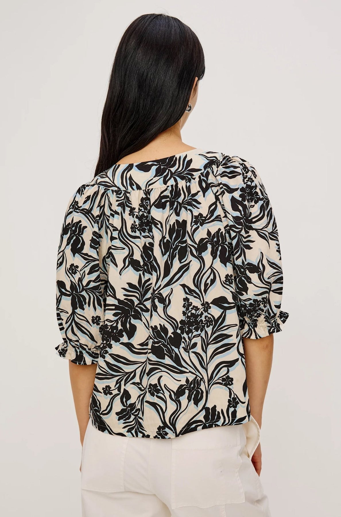 The Belina is an airy, lightly textured poplin top featuring a gathered, peasant-style V-neckline with self ties, a loose, flowing silhouette, and elbow-length sleeves with elastic ruffle cuffs.