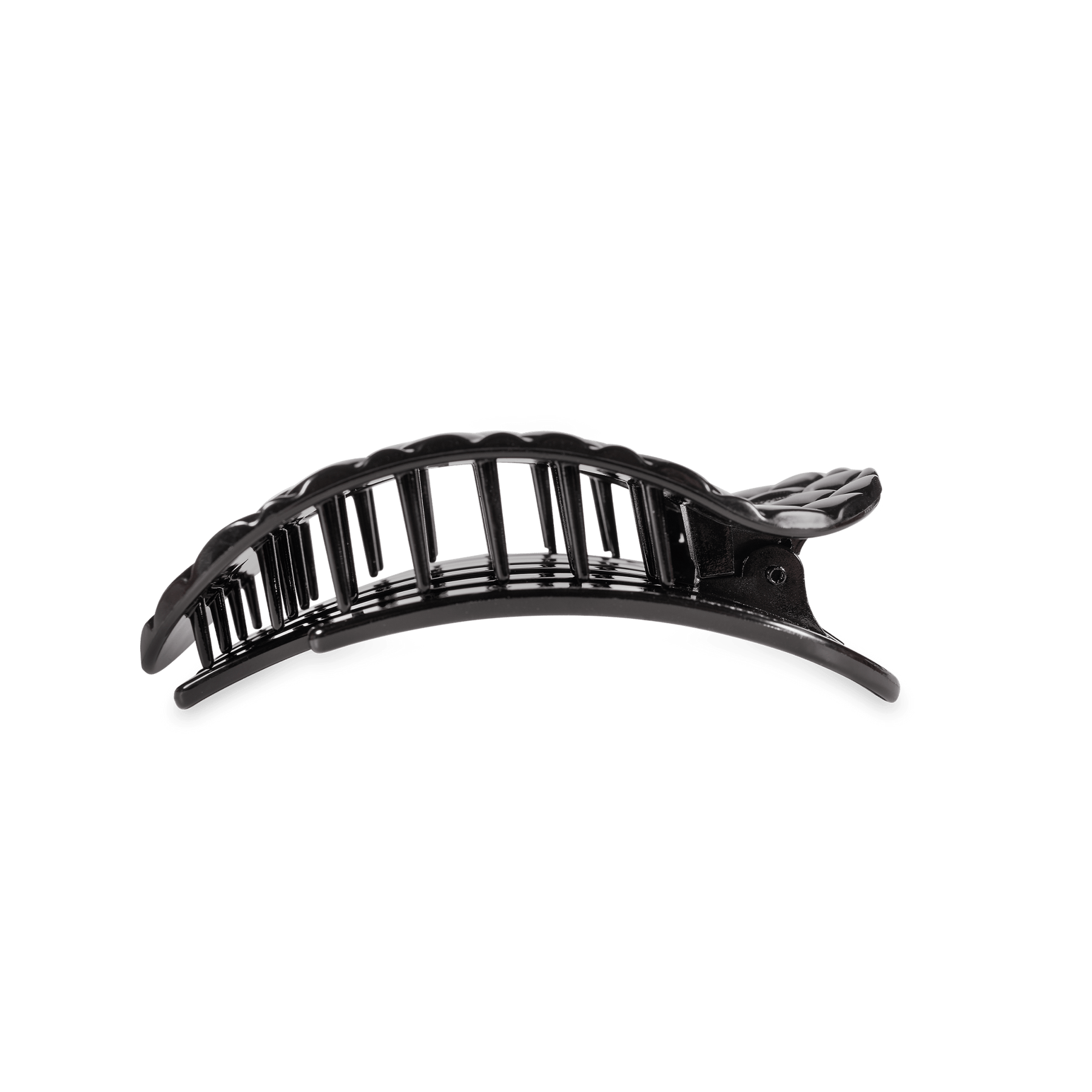 Lay flat and relax with the new TELETIES Jet Black Quilted Medium Flat Round Hair Clip in Black. This hair clip is designed to allow you to lay back flat, do yoga, or sit comfortably in a seat with a headrest, and it is made with the same material that is nearly unbreakable. Lay down flat with comfort Bendable teeth for a secure yet gentle hold Lightweight, durable, and suitable for all hair types Perfect for all-day wear—from sunup to sundown The medium size is 3.75 inches long.