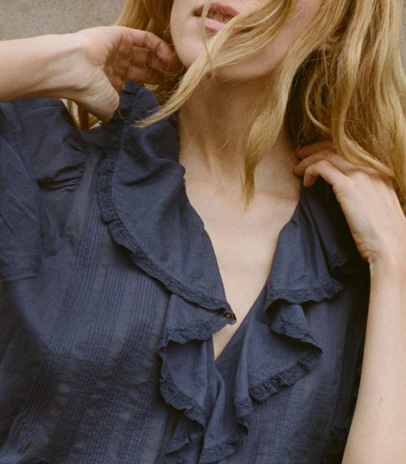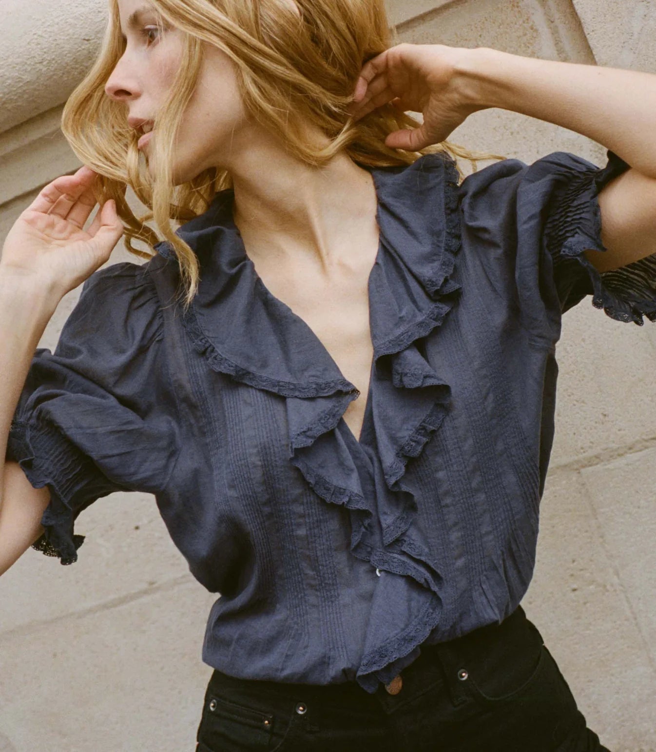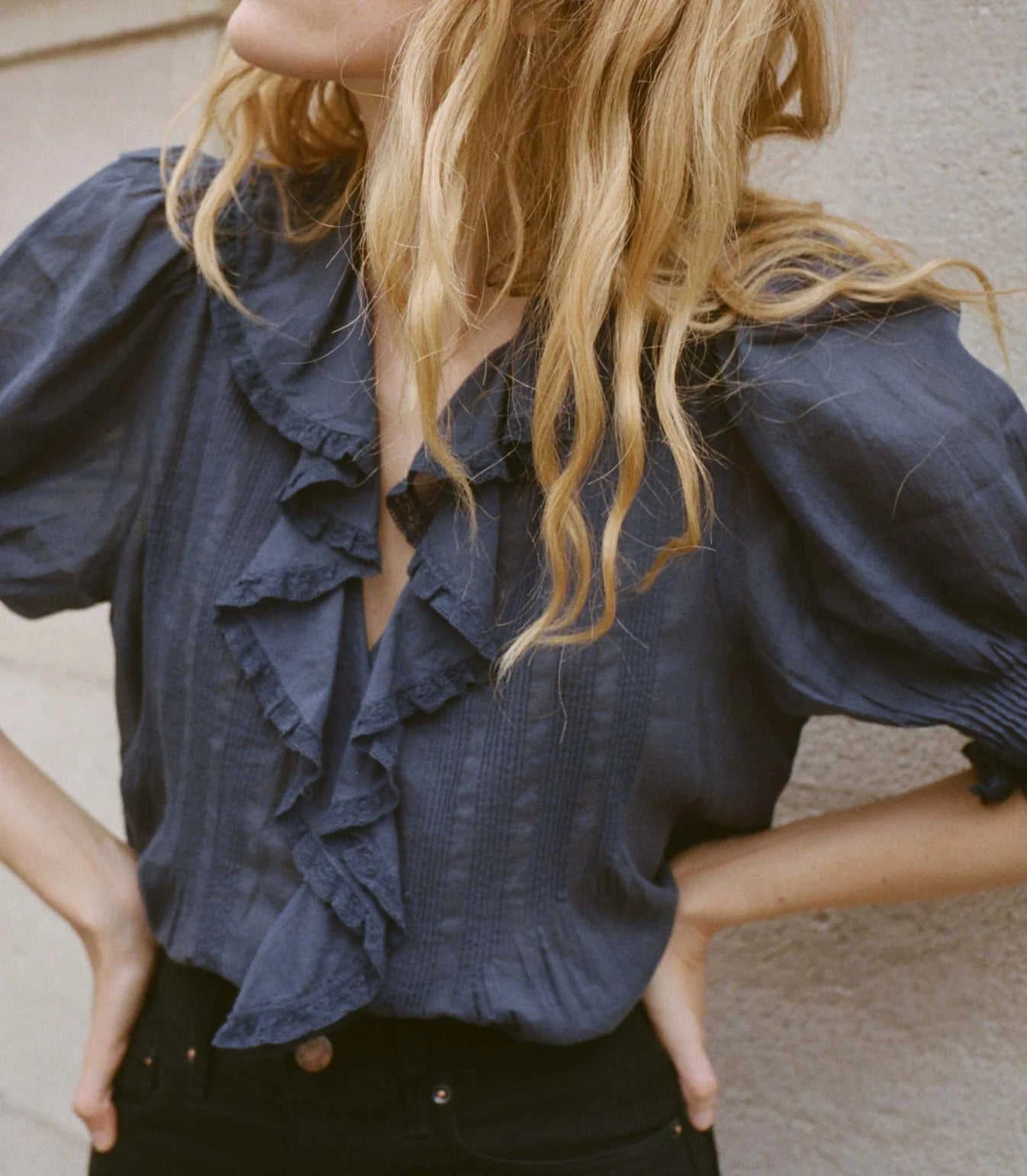 Crafted from the softest organic cotton voile, the Edwardian-inspired Henri Top—which made its debut in Spring 2018—is a Favorite Character we find ourselves returning to again and again. It features a plunging V-neckline framed with cascading lace-trimmed ruffles that extend down the bodice and delicate clustered pintucks at the yoke, back, and short puffed sleeves. A line of hidden starburst buttons run up the center front.