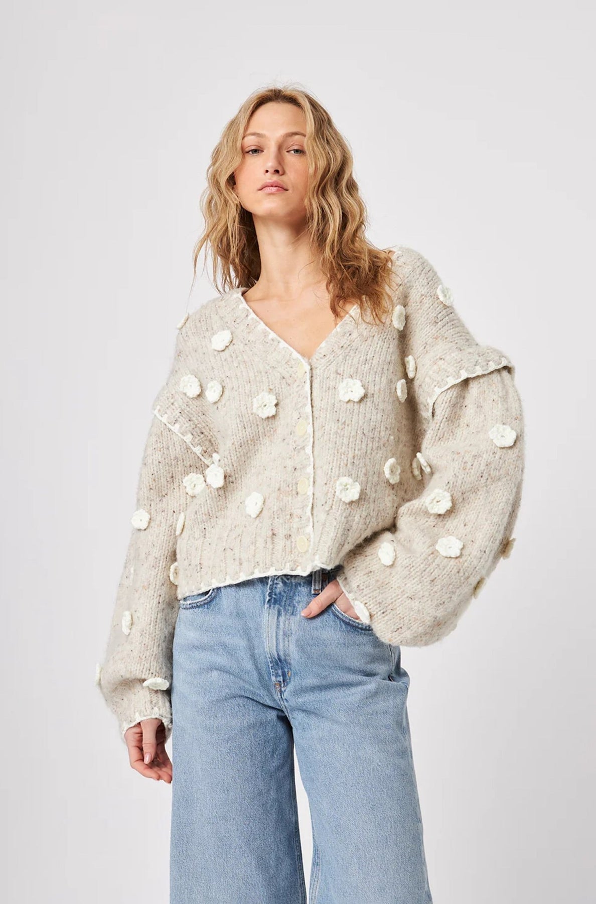 Effortlessly romantic, this lightweight button-up blouse features soft bubble-textured polka dots for added charm. Designed in a relaxed silhouette with a deep V-neckline and voluminous balloon sleeves, it brings a touch of femininity to any outfit. The natural beige tone makes it endlessly versatile—wear it tucked into denim or loose over a slip skirt for a breezy, laid-back look.