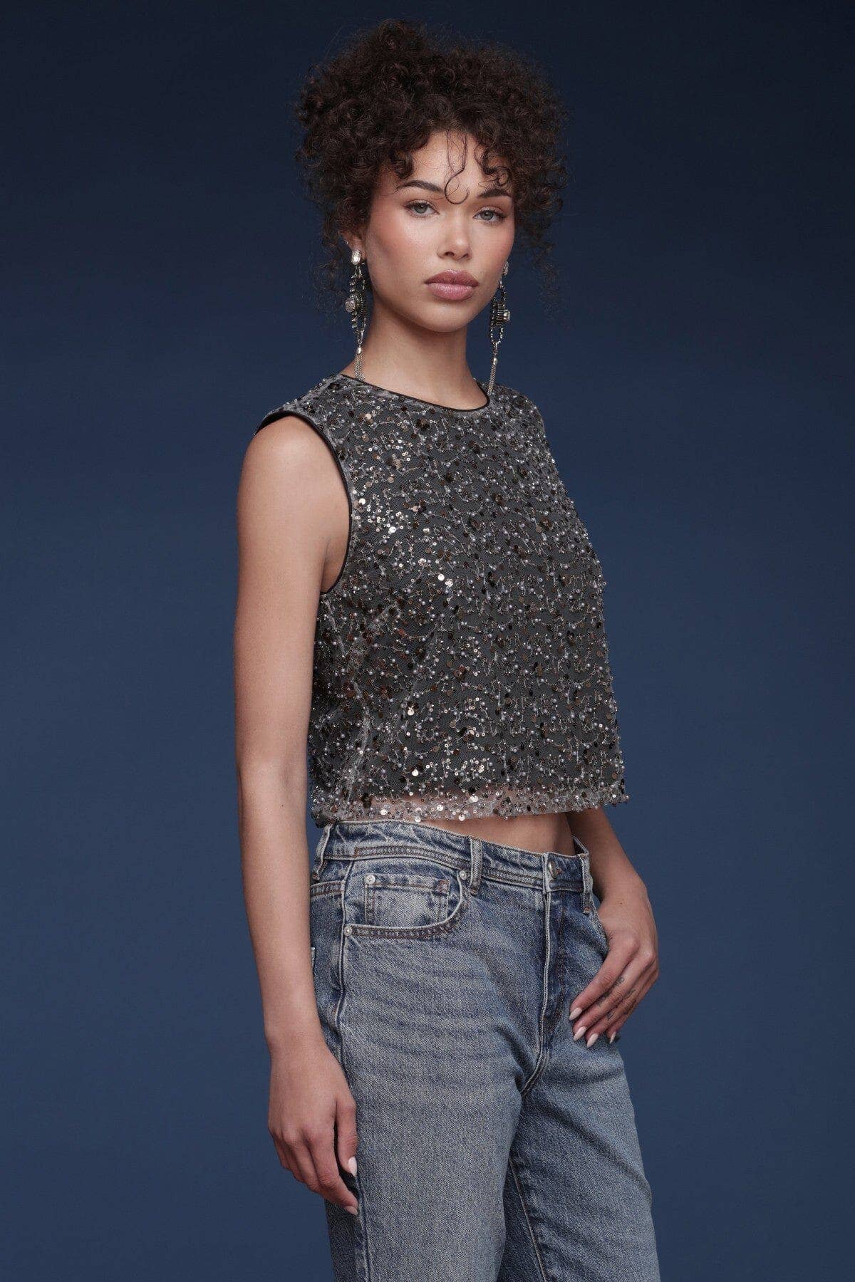With a glamorous nod to Art Deco opulence, this sleeveless mesh top is embroidered with cascading sequins and shimmering crystal embellishments. Its cropped silhouette and sheer overlay strike the perfect balance of elegance and edge designed to catch the light at every angle, whether styled with tailored trousers or high-waisted denim. Style #: 85605