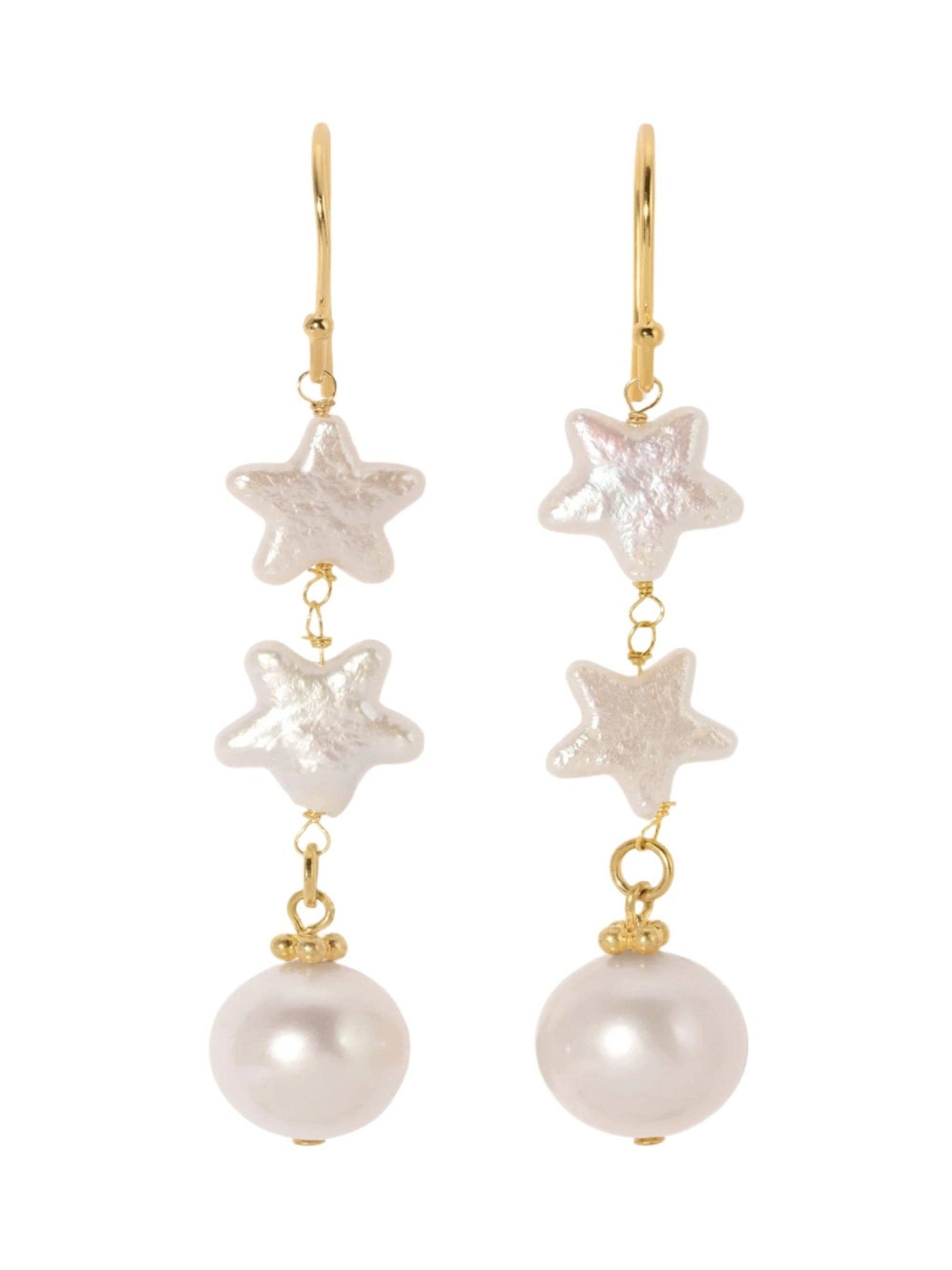 Perfectly pearly stars. Introducing The Star Pearl Earrings. The Star Pearl Earrings features ivory iridescent star shaped pearls and pinkish round pearl earrings. A rather chic and cute way to wear pearls. * Length: 3" * Made in Ojai, CA * E6692 * Made from plated brass * Plating is waterproof and tarnish free when cared for properly * See Jewelry Care instructions here * Jewelry is 100% nickel-free and cadmium-free Free Shipping on all orders $200+ Ships in 1-3 Business Days Easy Return & Exchanges 1 Year Warranty on All Repairs See Customer Reviews here