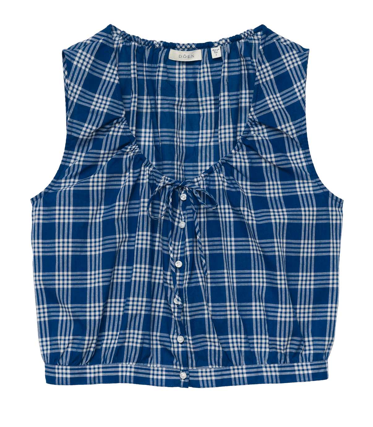 In midweight organic cotton voile rendered in our yarn-dyed Dorset Plaid, the Theo Top has a slightly cropped silhouette and a scoop neckline with a functional tie. A row of mother-of-pearl buttons runs down the center front.